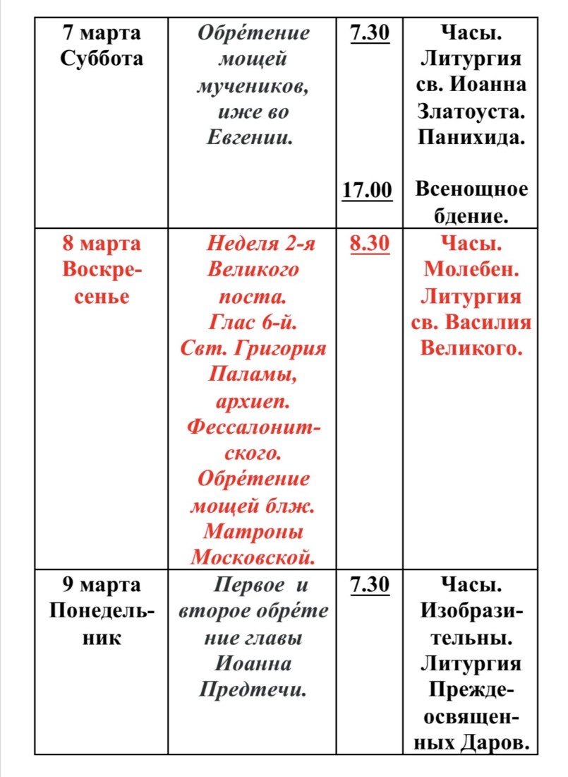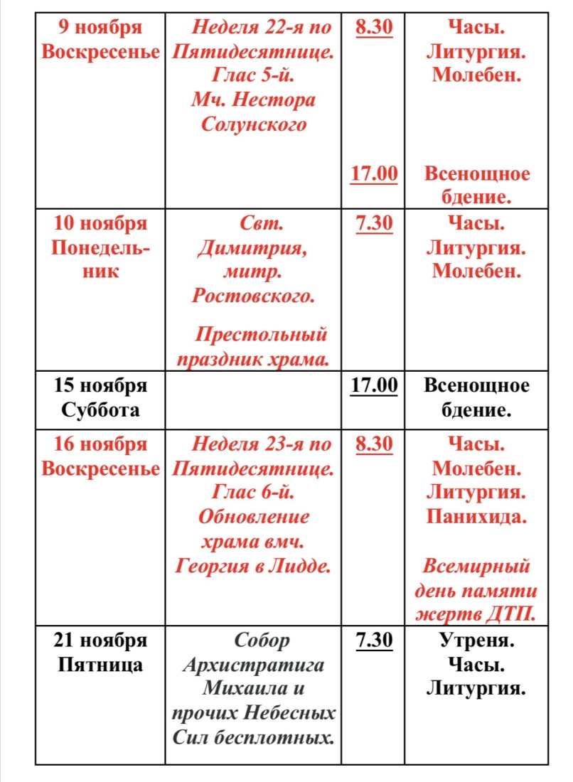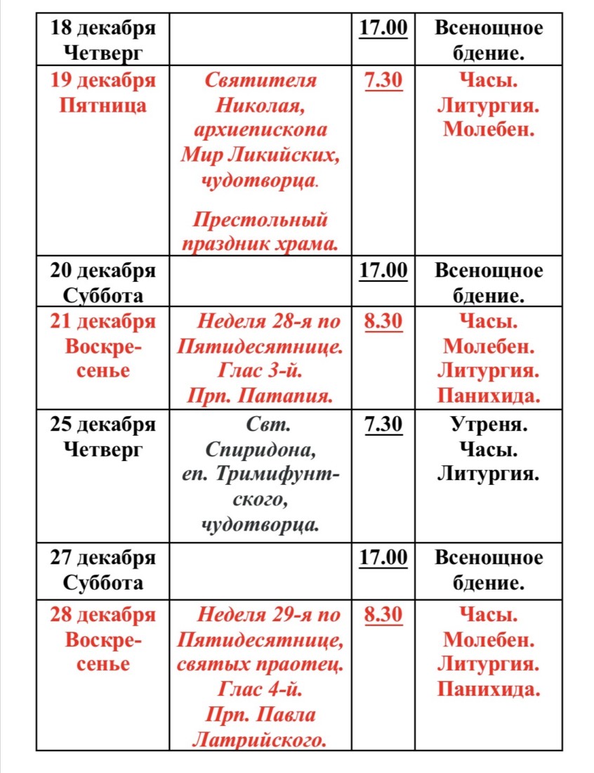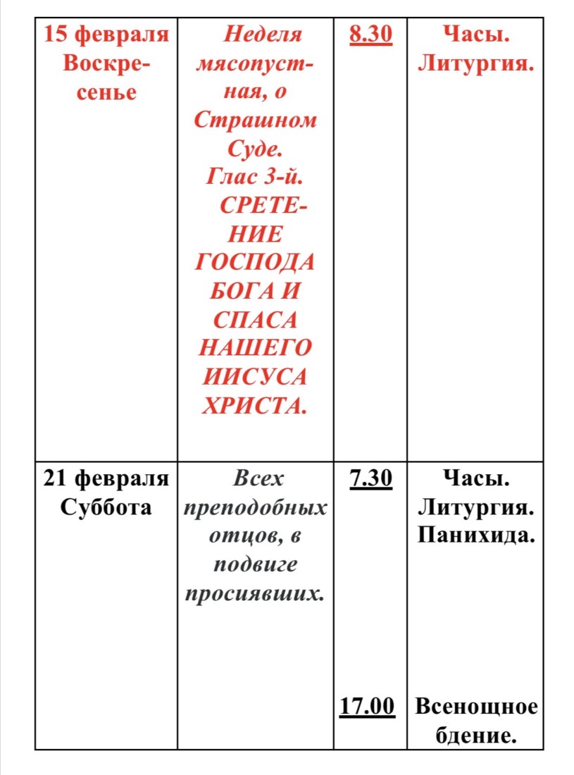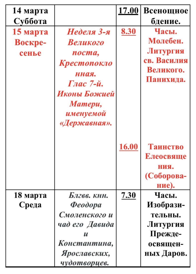 Расписание богослужений